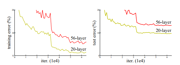 ์์ ์ฌ์ง์ ๋ณด๋ฉด tranining error, test error ๋ชจ๋ 20-layer๋ณด๋ค 56-layer์์ ๋๊ธฐ ๋๋ฌธ์ด๋ค.