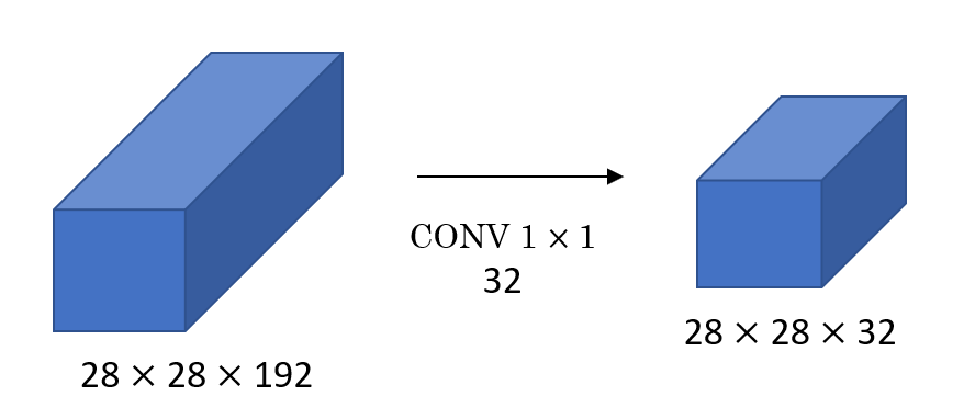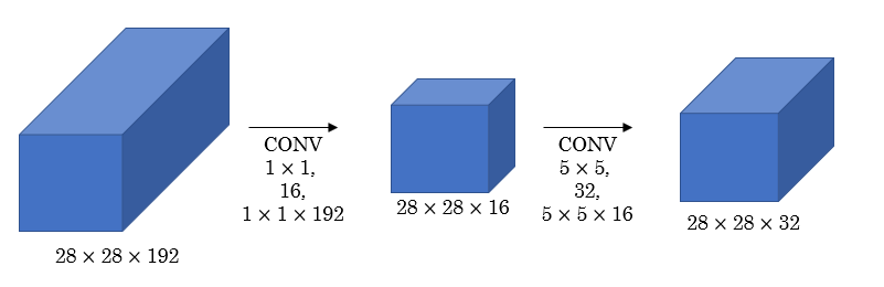 - (1) 28*28*192 feature map의 channel 수를 1*1 conv layer 사용해 28*28*16으로 변경