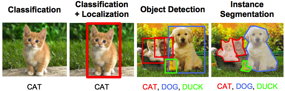 - Classification + Localiation - 사진 속의 대상이 무엇인지 식별 + 그 대상의 위치를 bounding box로 표시
