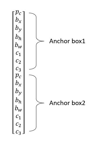 ์ด๋ ๊ฒ ์ฌ๋ฌ๊ฐ์ anchor box๋ฅผ ์ฌ์ฉํ๋ ๊ฒฝ์ฐ ๊ฐ cell์ ๋์๋๋ label์ ๋ค์๊ณผ ๊ฐ๋ค.