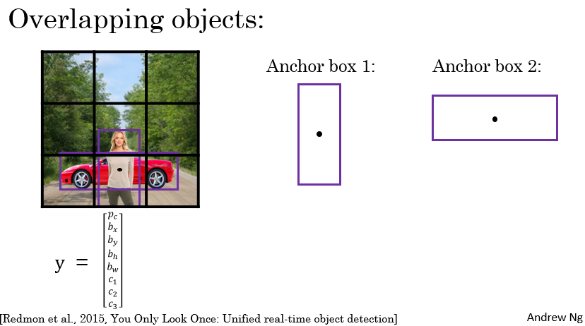 - ์ด๋ฌํ ๊ฒฝ์ฐ ์ฌ๋ฌ๊ฐ์ anchor box๋ฅผ ์ฌ์ฉํ์ฌ ๋ฌธ์ ๋ฅผ ์ด๋์ ๋ ํด์ํ ์ ์๋ค. (๋ค ํด๊ฒฐํ๋ ๊ฒ ์๋๋ค)