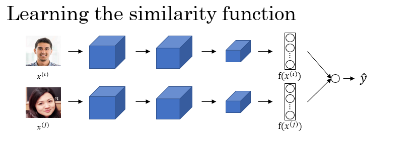 $$ \hat y = \sigma(\sum_{k=1}^{V}w_k |f(x^{(i)})_k-f(x^{(j)})_k|+b) $$
