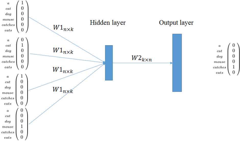 보면 input으로는 주변 단어의 one-hot vector가 들어가고, output으로는 N*1차원의 vector가 나온다.